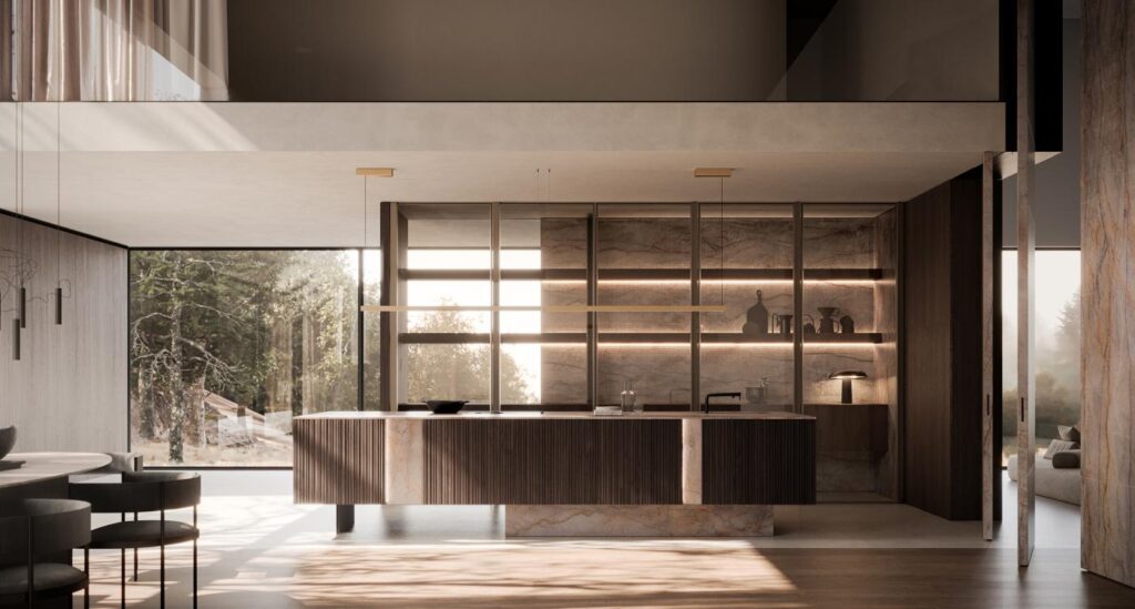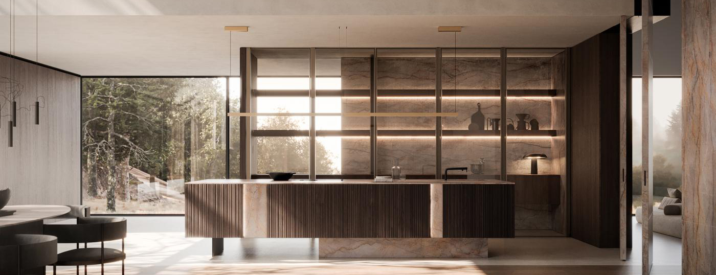 Cucina Modulnova Vertical con l’elegante isola sospesa, al centro della composizione, rappresenta un vero e proprio inno alla forza della natura. Ogni lastra di marmo è unica, un pezzo d’arte naturale. Legno e pietra avvolgono l’intero volume dell’isola che poggia su un basamento sempre in pietra e su una doppia lama in metallo.