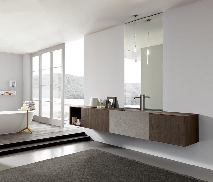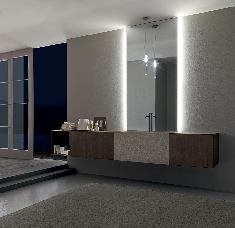 Una lavorazione elegante della Pietra Piasentina arricchisce di significato il grande blocco a terra con lavabo integrato.
